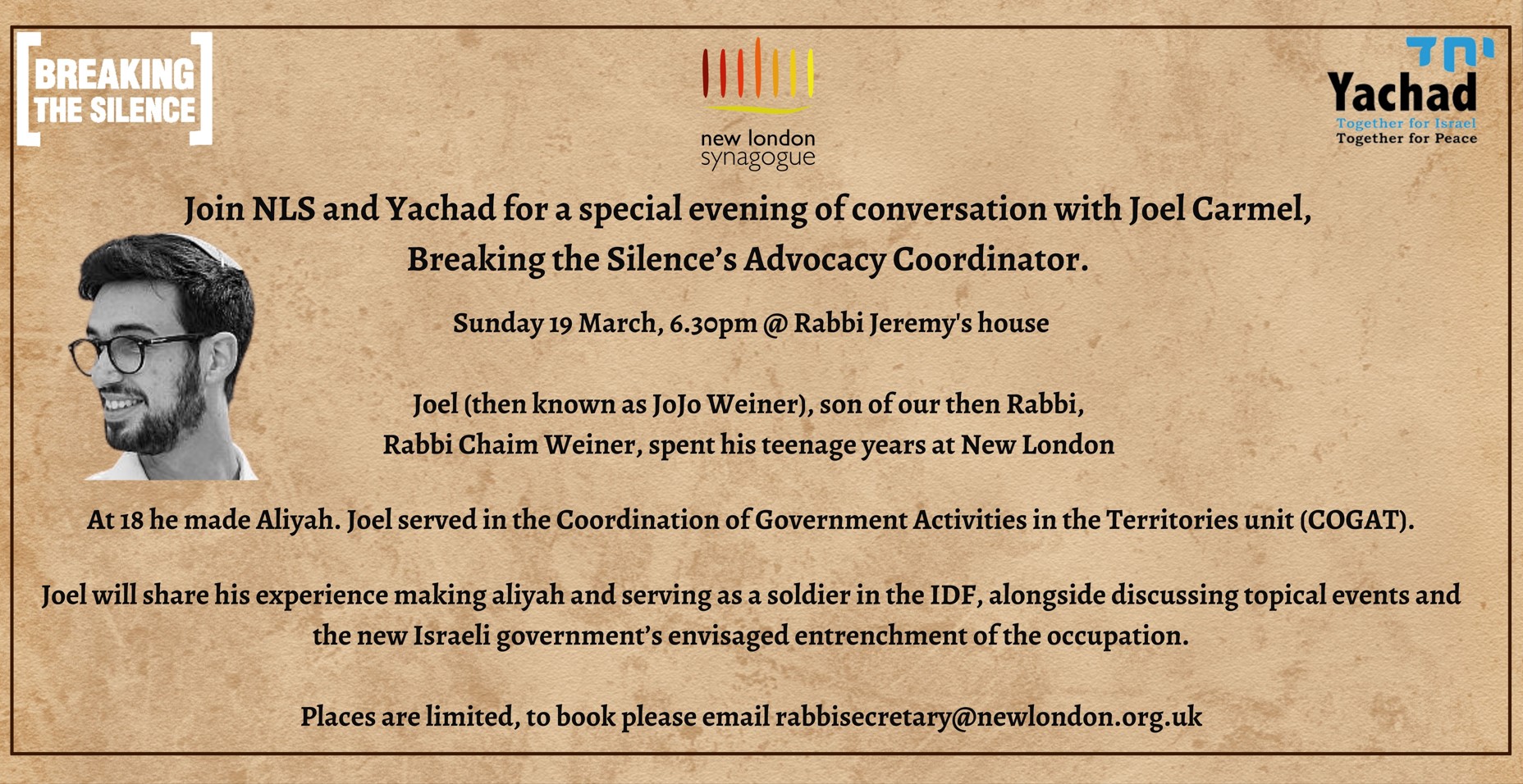 Join NLS & Yachad for a special evening of conversation with Joel Carmel, Breaking the Silence’s Advocacy Coordinator